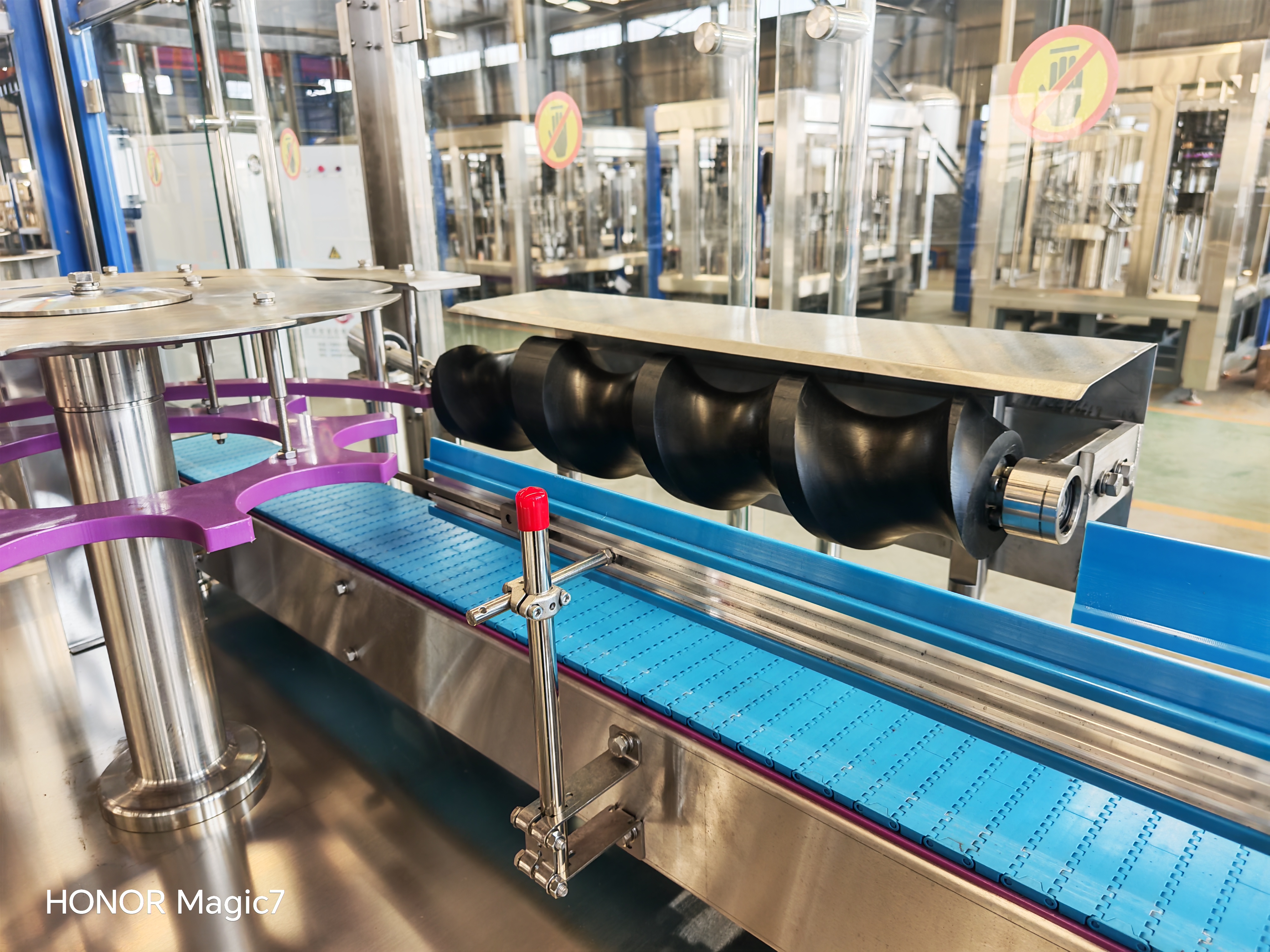 輸送與三合一灌裝機(jī)直連。該方式的優(yōu)點(diǎn)是:瓶子輸送穩(wěn)定,杜絕掉瓶現(xiàn)象。在一定范圍內(nèi),瓶口尺寸波動(dòng)不會對正常傳輸產(chǎn)生影響。